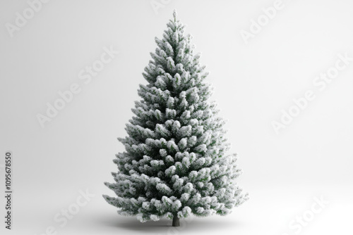 Small Christmas tree covered in snow, standing tall against a winter backdrop.