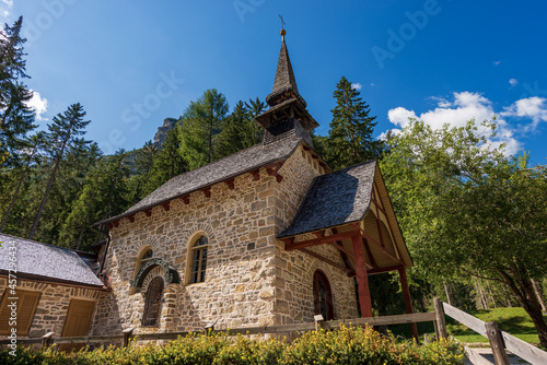Small Church (Marienkapelle or Cappella di Maria) on the coast of Pragser Wildsee or Lago di Braies, small alpine lake in Braies valley, Dolomites, Trentino-Alto Adige, Bolzano, Italy, Europe.