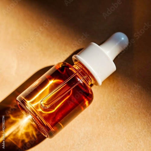 Small clear bottle with brown liquid and a white dropper on a light brown surface with strong shadows.