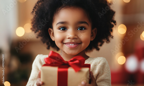 Small cute afroamerican little girl holding gold present gift box with red ribbon, giving receiving presents on holiday event.