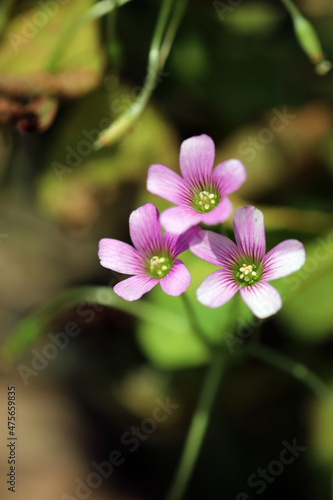 Small cute flower "Violet(pink) wood-sorrel". ムラサキカタバミの小さな紫色の花が3連で写ったマクロ接写写真