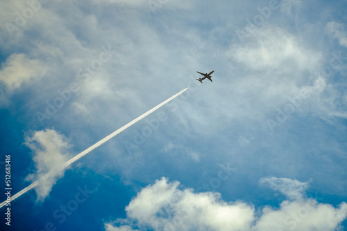 Small dark airplane silhouette flying high up in the blue cloudy sky. The aircraft in the sky. Airplane condensation trace. Traveling by plane.