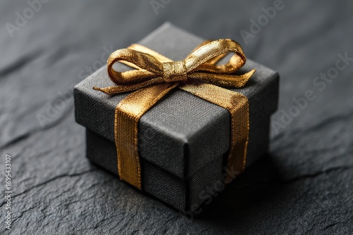 Small, dark gray gift box with gold ribbon bow on dark stone