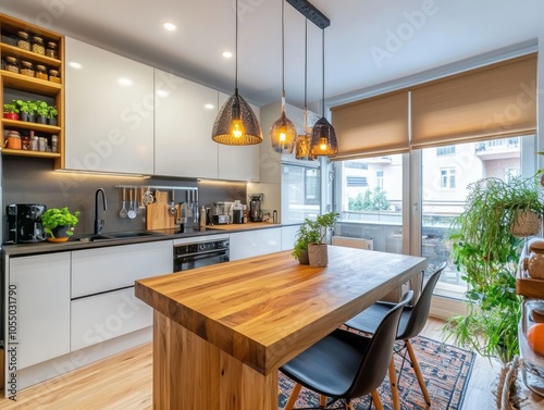 Small dining room and kitchen with a wooden bar table integrated into an open kitchen