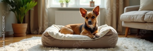 Small dog resting on designer pet bed in chic apartment, companion, friends