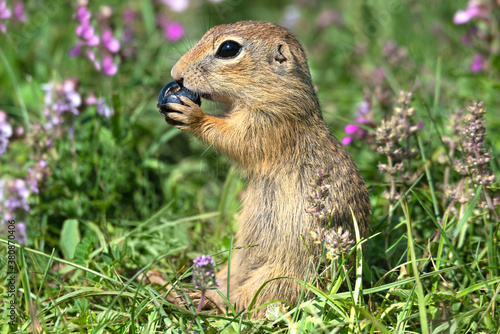 Small European ground squirrel (Spermophilus citellus) eating blueberry sitting in the grass and beautiful violet thyme flowers.