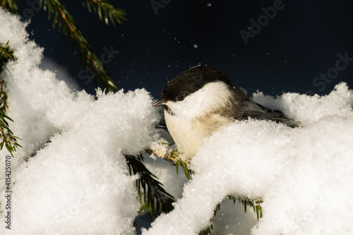 Small European woodland bird Willow tit, Poecile montanus perched on a really snowy spruce branch during a winter day in Estonian forest.
