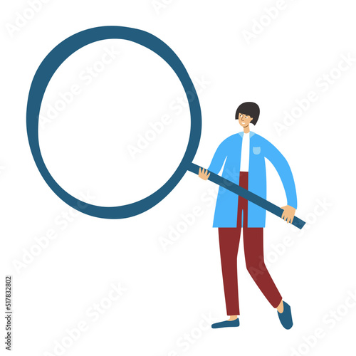Small female doctor in blue medical robe holding huge magnifier in hands. Healthcare staff at work. Research practitioner in laboratory uniform. Cartoon character student doing research project.