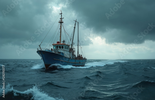 Small fishing boat sailing on rough wavy sea under dark stormy sky. Fishing vessel in wavy water during bad weather day. Maritime transport and industry on horizon.