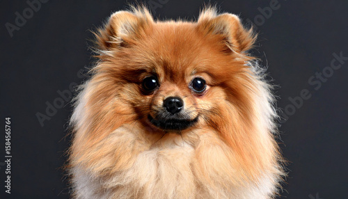 Small fluffy dog with reddish fur and large dark eyes looks uncertain against dark background, showing symmetrical face and soft texture in close up portrait