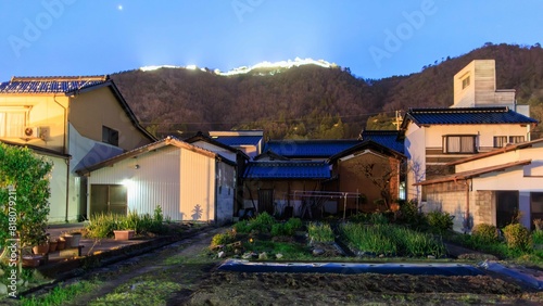 Small garden by houses in quiet neighborhood with lights from Takeda Castle at night