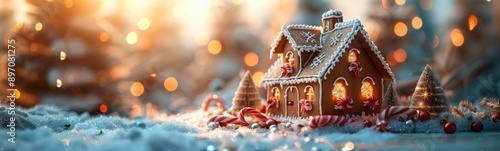 Small ginger house with candy canes and candy canes. Christmas holiday background