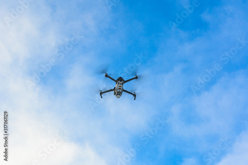 Small gray drone flying in the sky, quadcopter on a cloudy sky background.