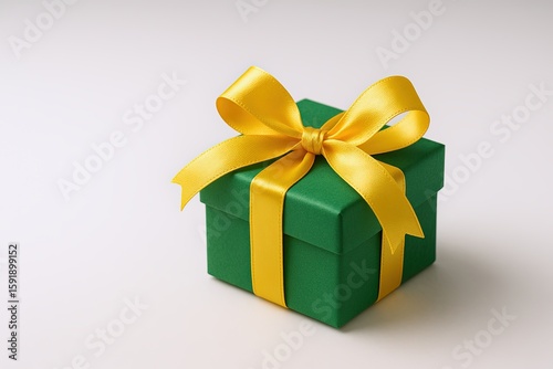 Small Green Gift Box with Gold Ribbon and Bow, Festive Holiday Present Decor.