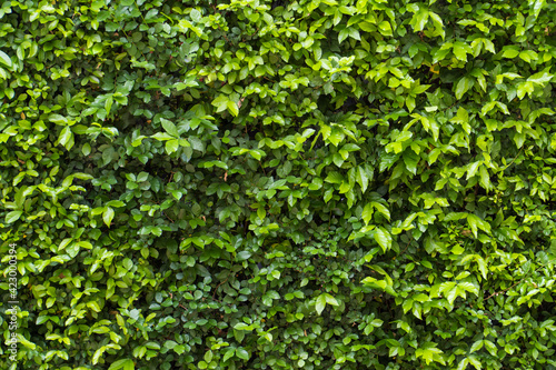 Small green leaves texture background with beautiful pattern. bush wall. Clean environment. Ornamental plant in the garden. Eco wall. Organic natural background. Many leaves reduce dust in air. Tropic