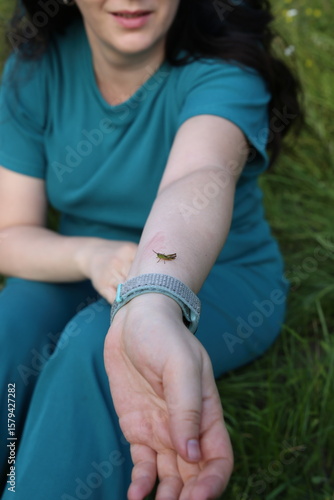 Small green locust or grasshopper sits on woman's hand
