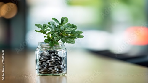 Small green plant sprouting from a jar of coins on a desk, symbolizing financial growth and new beginnings