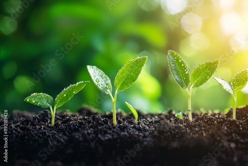 Small green seedlings sprouting, with dew on the leaves and a moss background.