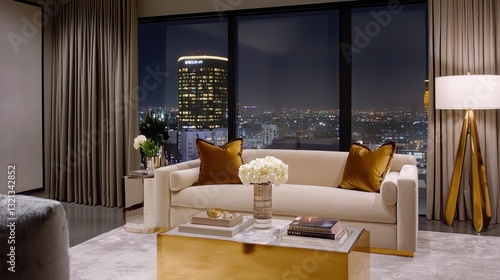 Small Hollywood brutalist living room, deep gray walls, plush cream velvet sofa, soft lighting, heavy curtains, night city view
