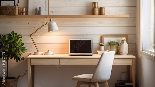 Small home office nook with a compact desk, a tablet stand, a minimal lamp, and a few essential stationery items on a clean surface.