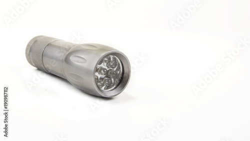 Small home pocket led flashlight in hand on the white