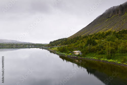 Small house reflecting in the lake during a cloudy day