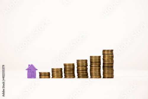 Small house with growing coins. Concept of saving money to buy a house.