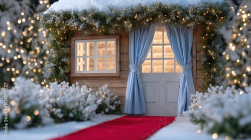 Small house with white door and red carpet entrance, daytime exterior, suburban setting, clear sky.