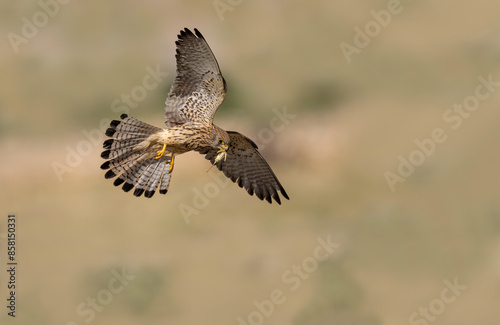 Small kestrel. It was photographed in the Konya region of Turkey, while it was flying and carrying the hunted food in its mouth to its young.