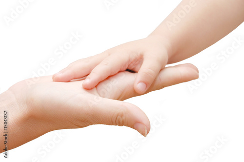 Small kids hand in woman hand on white