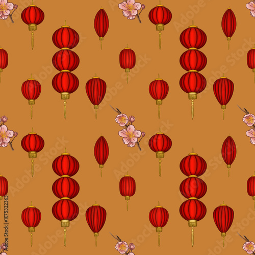Small Lanterns with Sakura on Yellow Background Seamless Pattern Design
