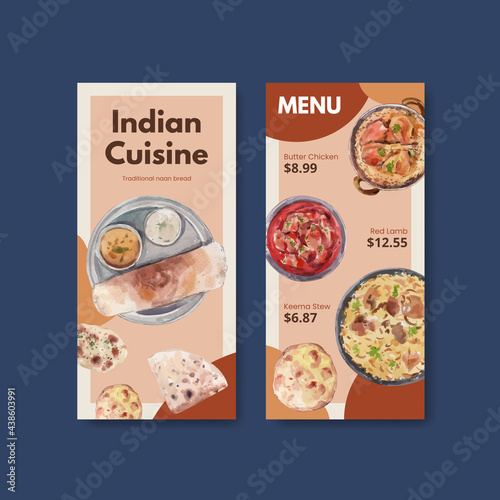 small Menu template with Indian food concept design for restaurant and bistro watercolor illustraton