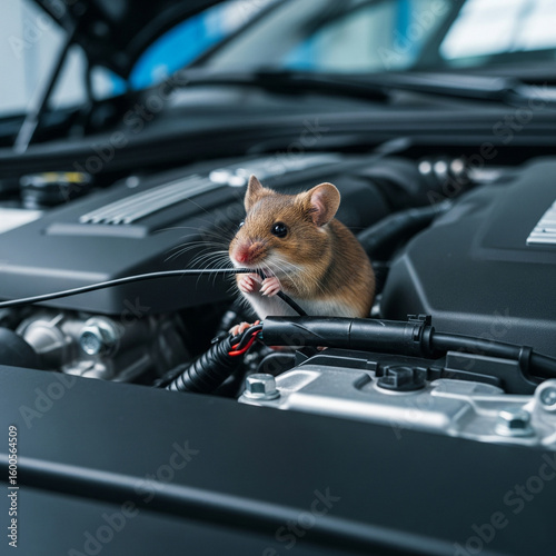 Small mouse gnawing on a wire in a modern vehicle engine bay