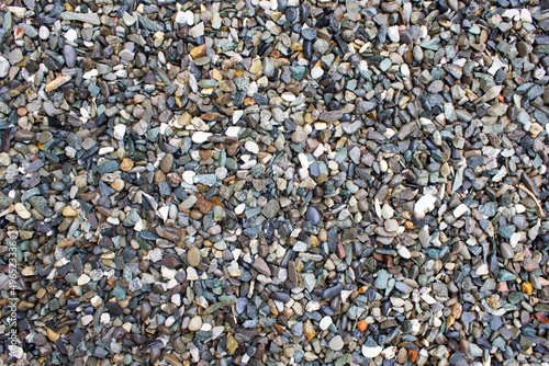 Small multi-colored pebbles lie in an even layer. Imitation of the sea coast in garden design.