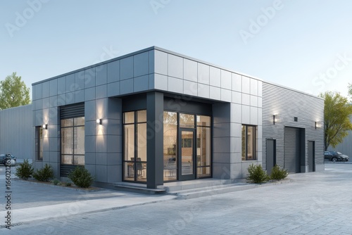Small Office Exterior. Modern Warehouse Building with Office Unit in Architecture Design