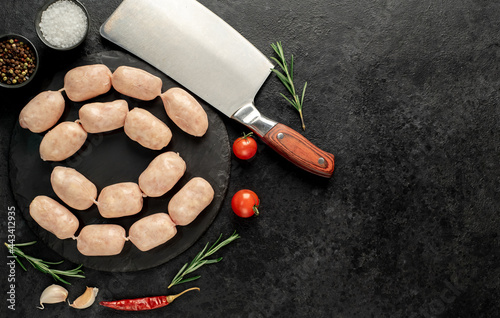 small raw sausages on stone background with copy space for your text