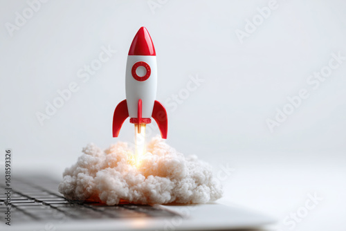 Small red and white rocket launching from laptop keyboard with smoke clouds symbolizing startup growth innovation and technology success