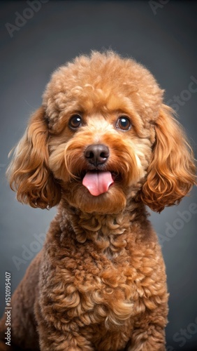 small red poodle on grey background licking lips after eating