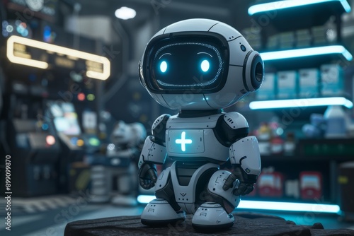 Small robot with a glowing display in a high tech environment symbolizing AI integration cybernetic technology and futuristic robotics