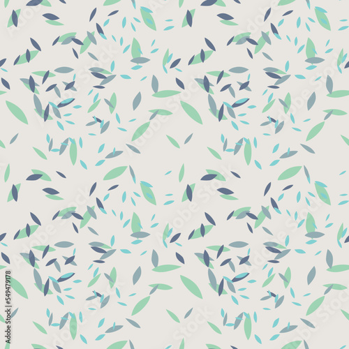 Small scale scattered foliage seamless repeat pattern in greens, greys and blues on an off-white background