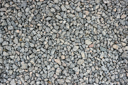 Small stone texture or gravel for background or design. Dark grey closeup small rocks. Real grunge texture background. Grey pebbles stone texture seamless texture. Top view of ground gravel road.