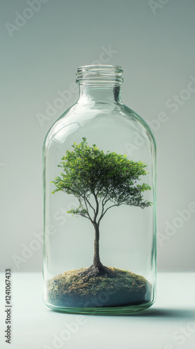Small tree grows inside clear glass bottle, symbolizing nature beauty
