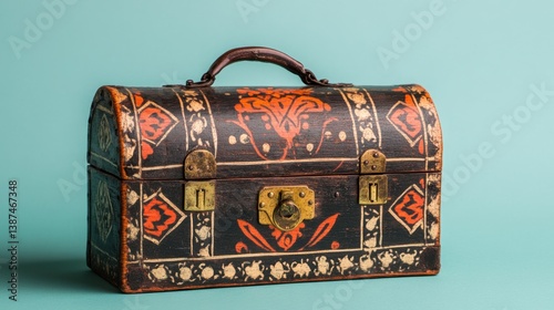 Small trunk with decorative patterns on sage green background, elegance in detail