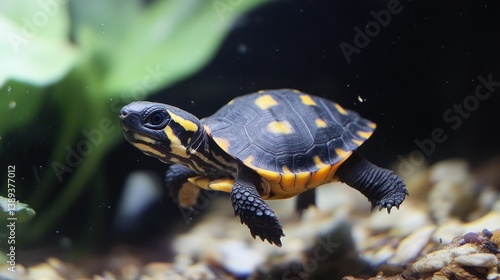 Small turtle swimming in aquarium, close-up