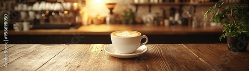 Small white board, latte on counter, stylish cafe, warm tones, 8K HD detail