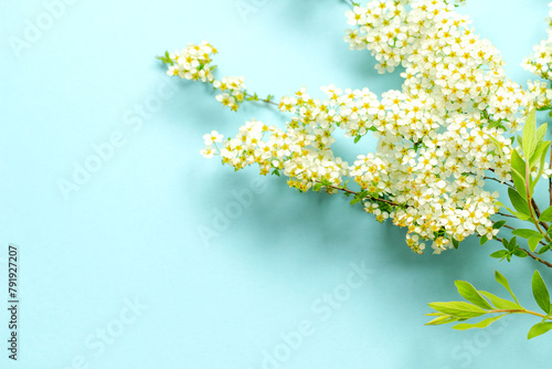 small white cherry flowers on a branch on a plain blue background, Spiraea spring blooming