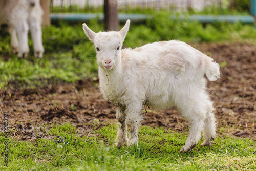Small white goat kid standing on lush green grass in a farm setting, embodying the essence of rural life and livestock farming