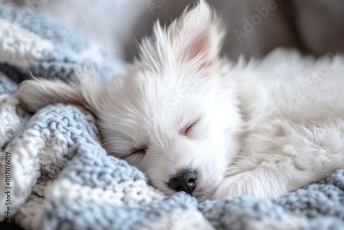 Small white puppy sleeping on a soft blue and white knitted blanket, enjoying a peaceful nap