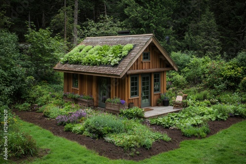 Small wooden cabin with a green roof surrounded by lush gardens and trees. Peaceful and serene nature scene.