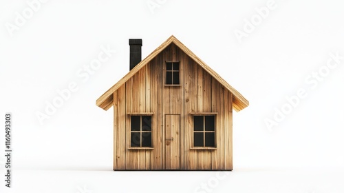 Small wooden house model on white background.